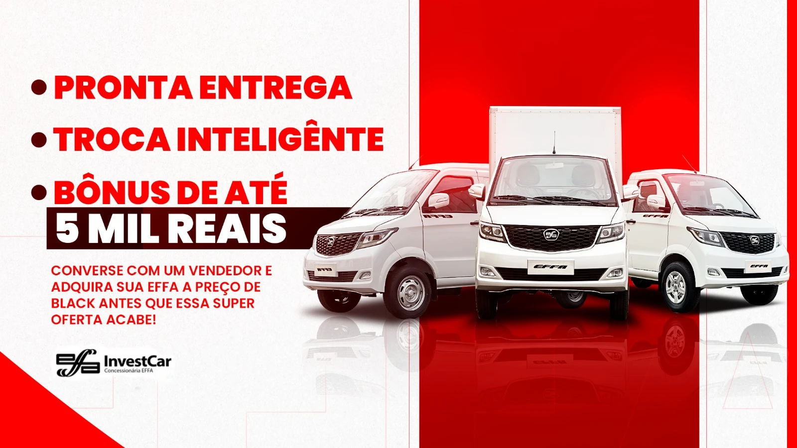 A InvestCar BH é a maior concessionária da EFFA Motors em Minas Gerais e tem as melhores condições para você comprar seu 0KM. Conheça os modelos disponíveis!